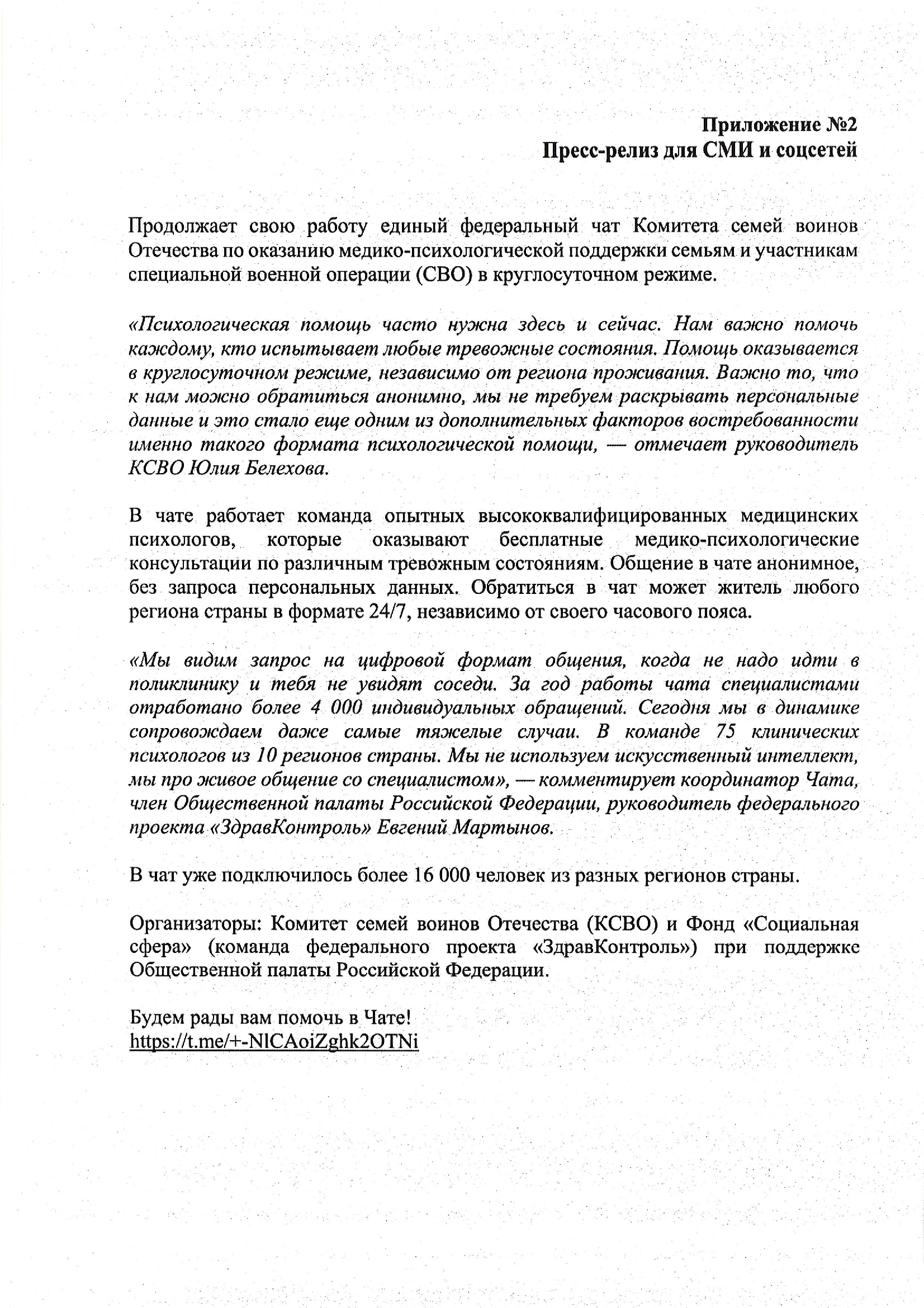 С июля 2024 года работает единый федеральный телеграм-чат медицинской психологической поддержки для семей воинов